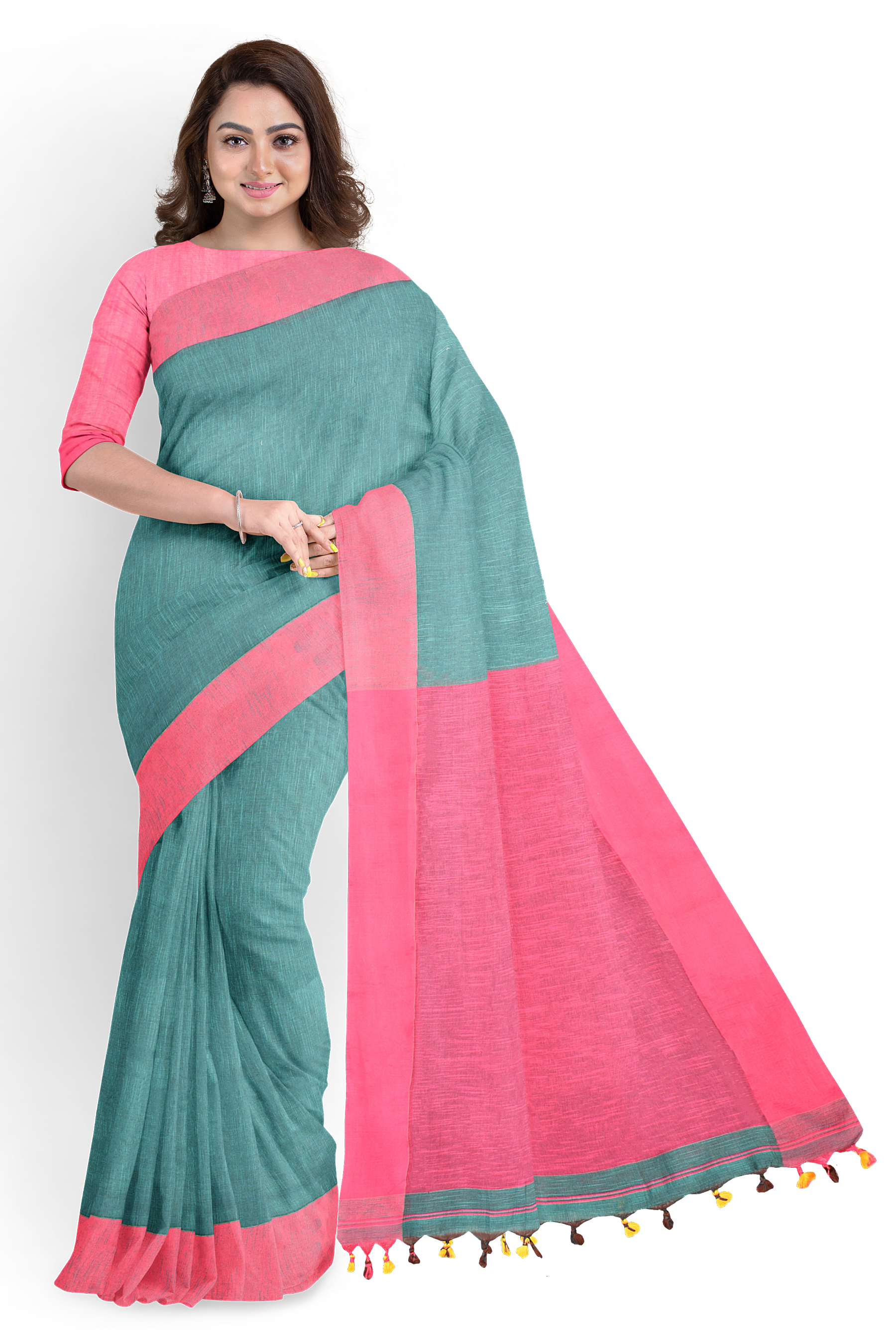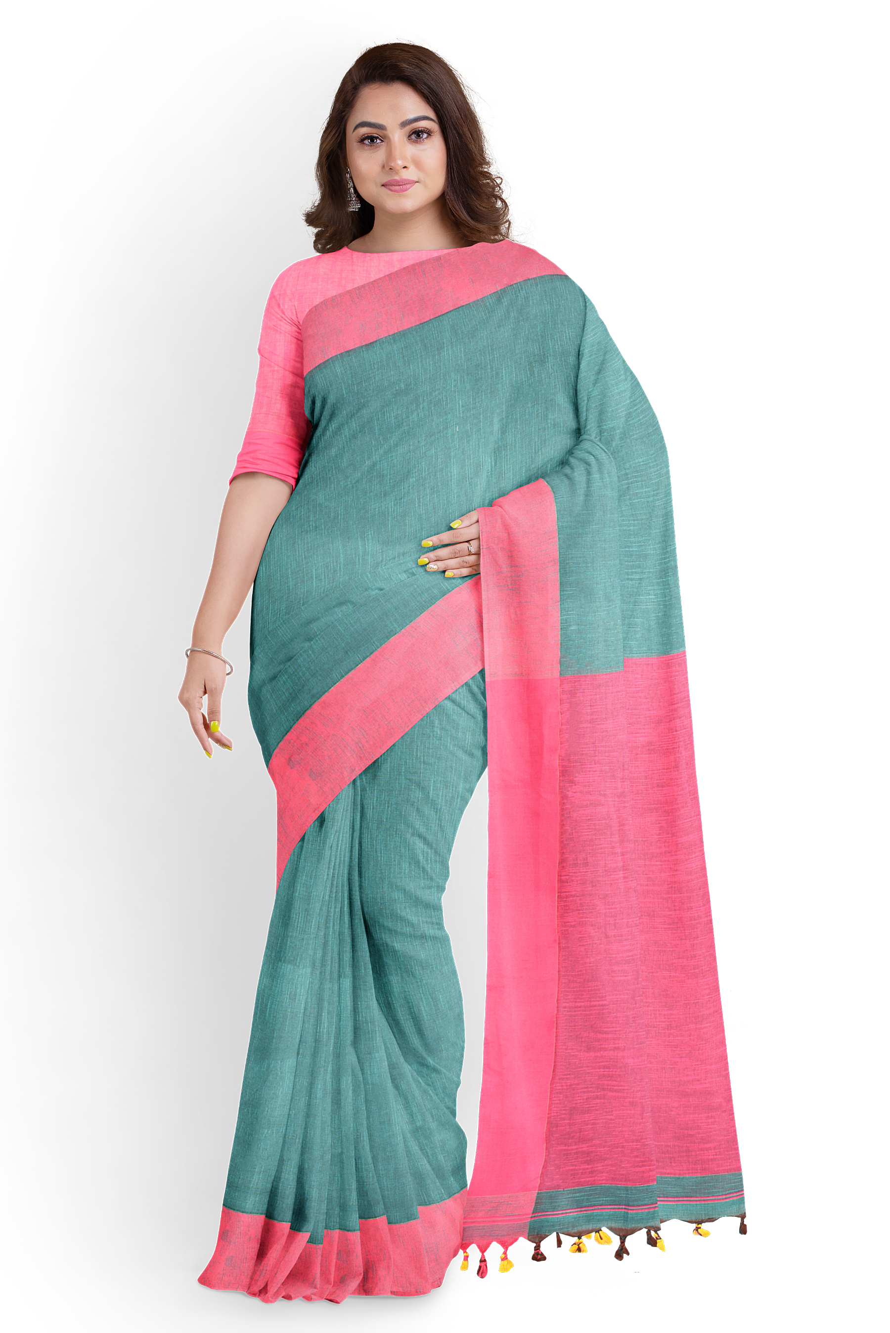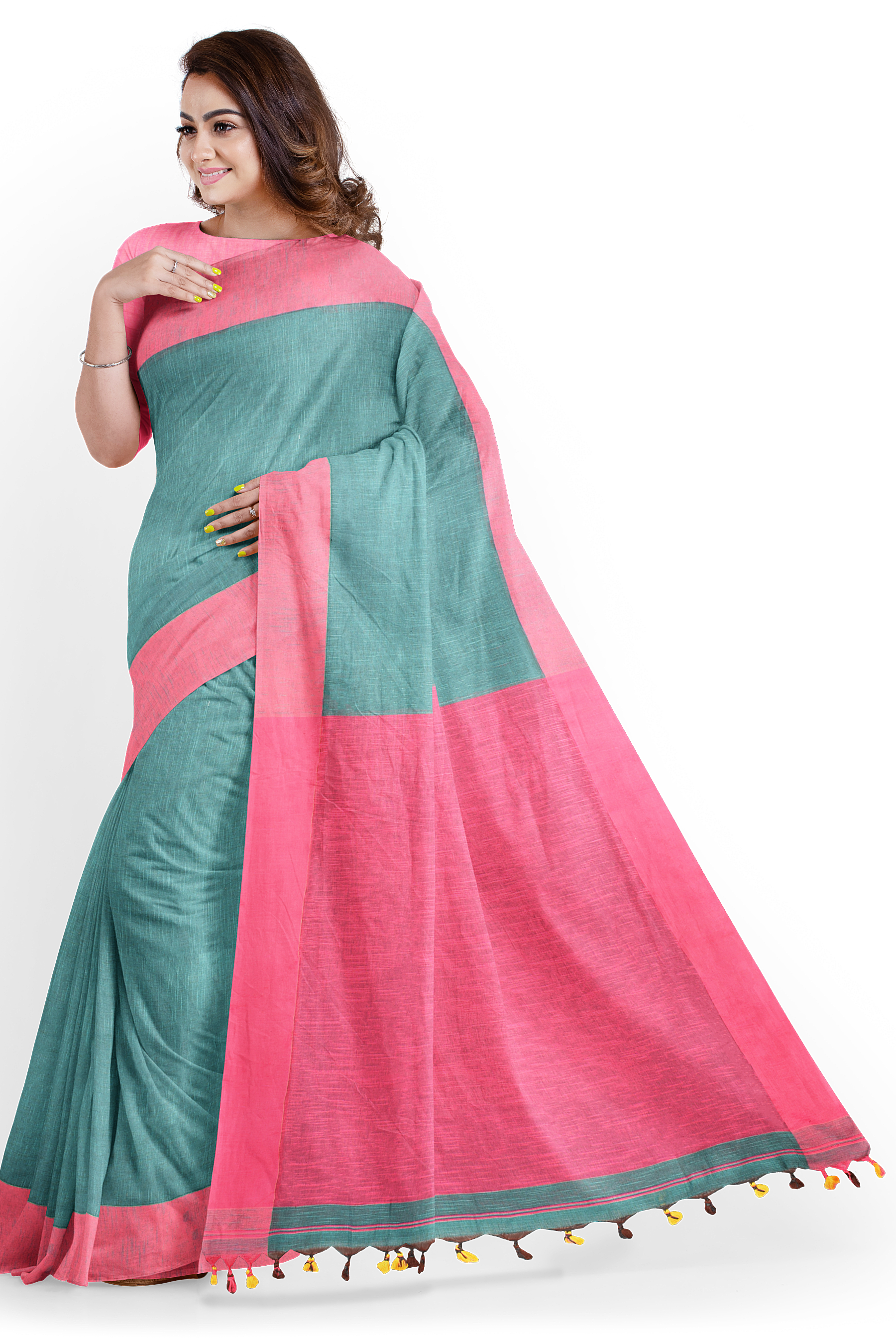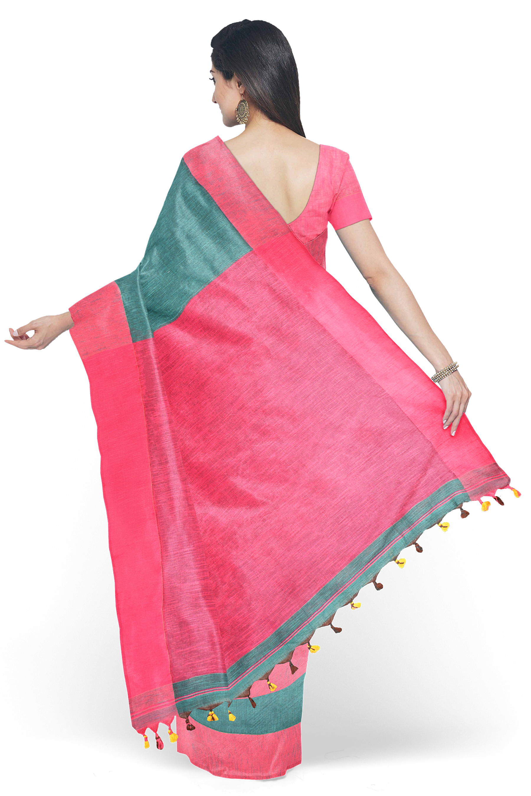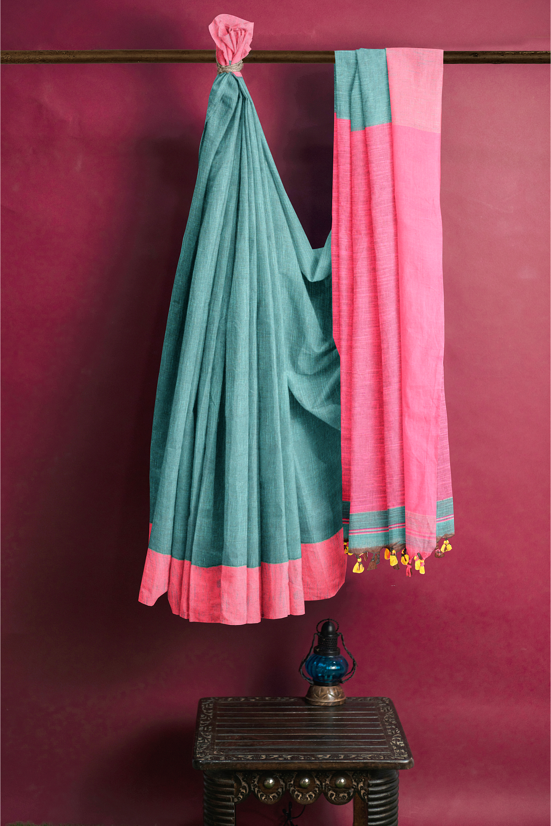 Moitreyee Signature Handloom Saree – Pink & Green Khadi Cotton Elegance