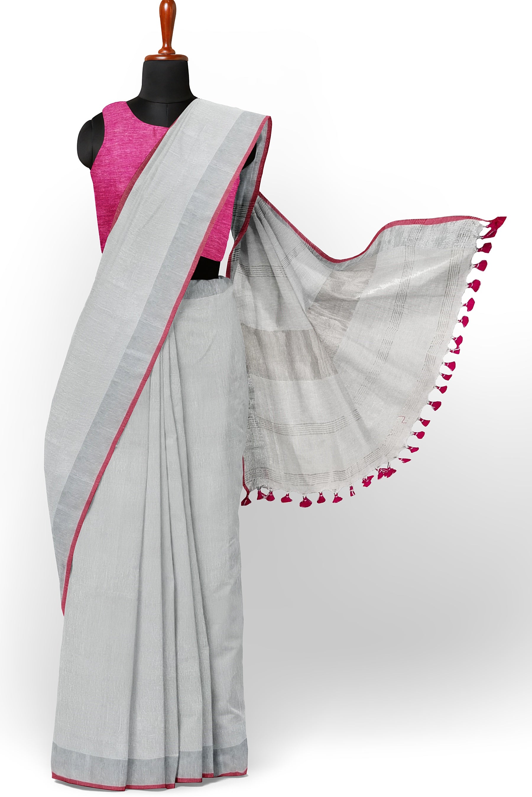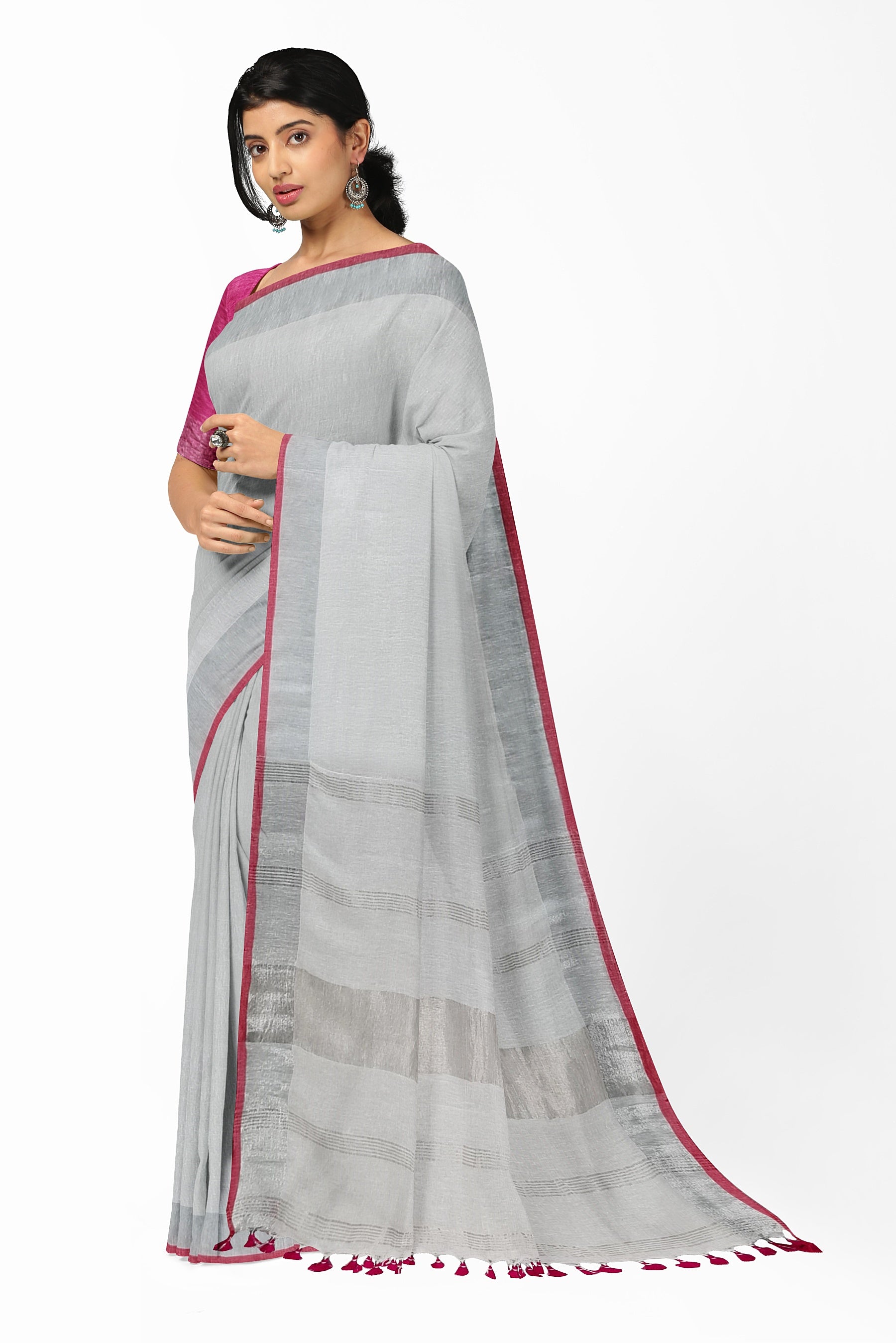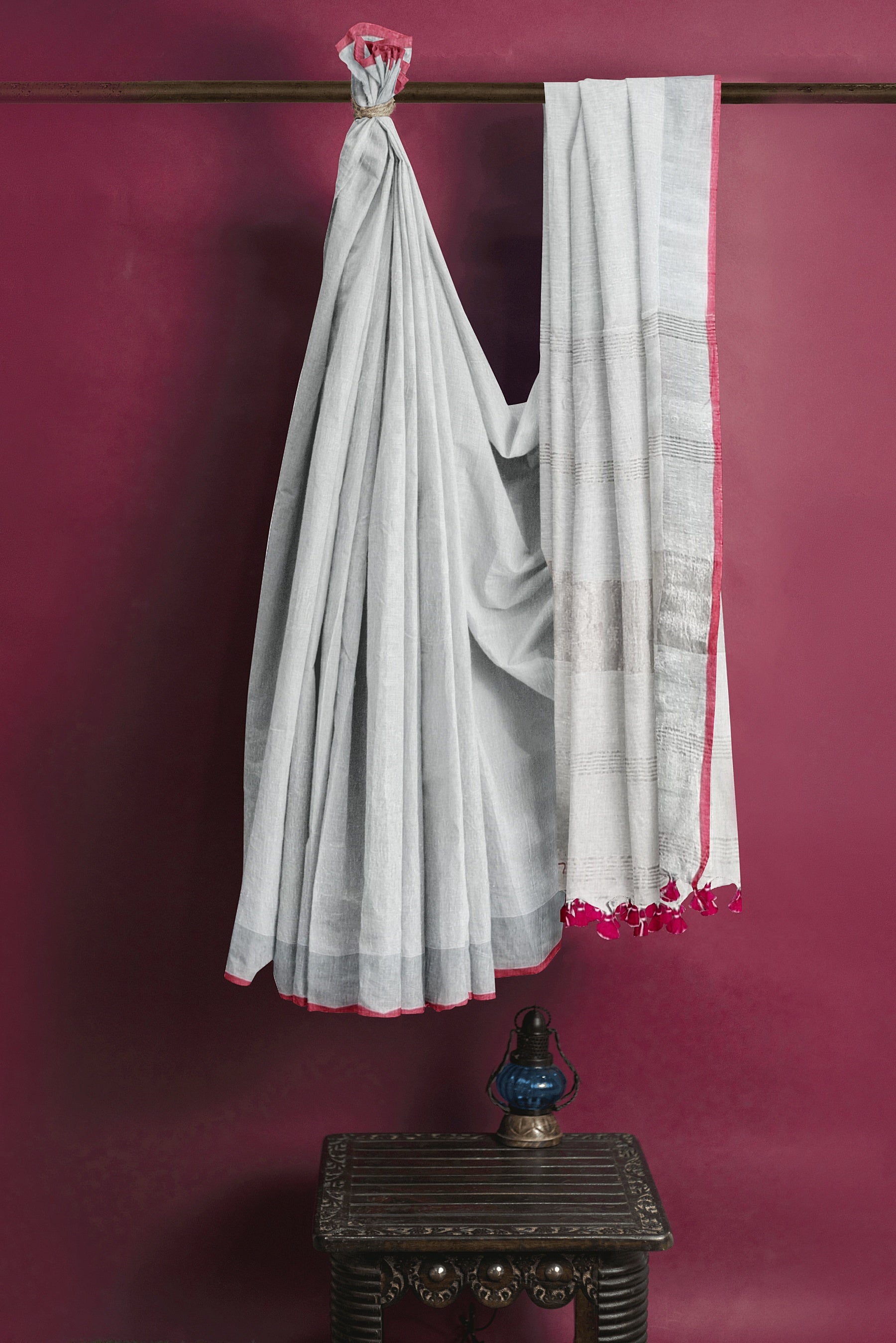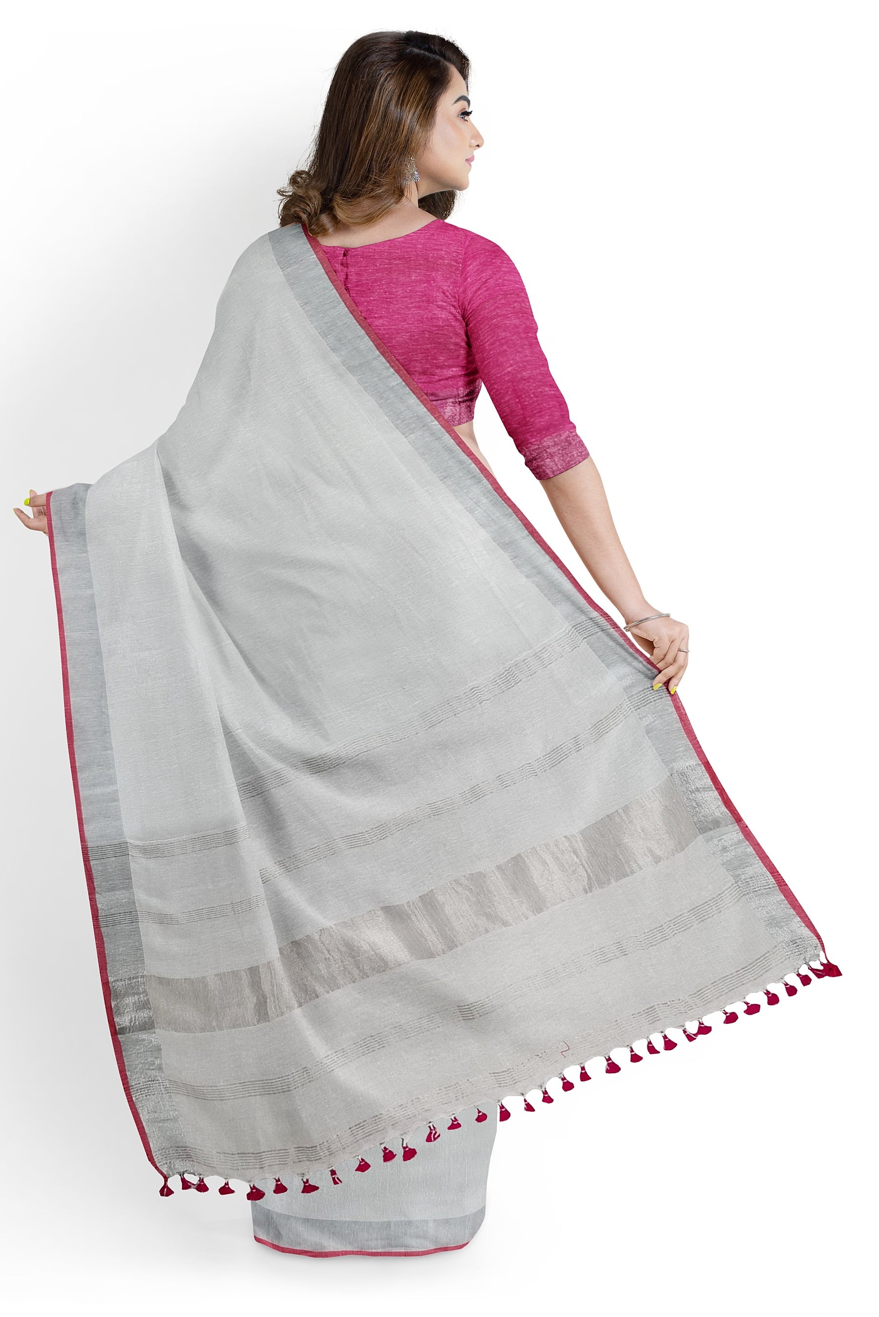 White & Silver Linen Handloom Saree – Moitreyee Collection
